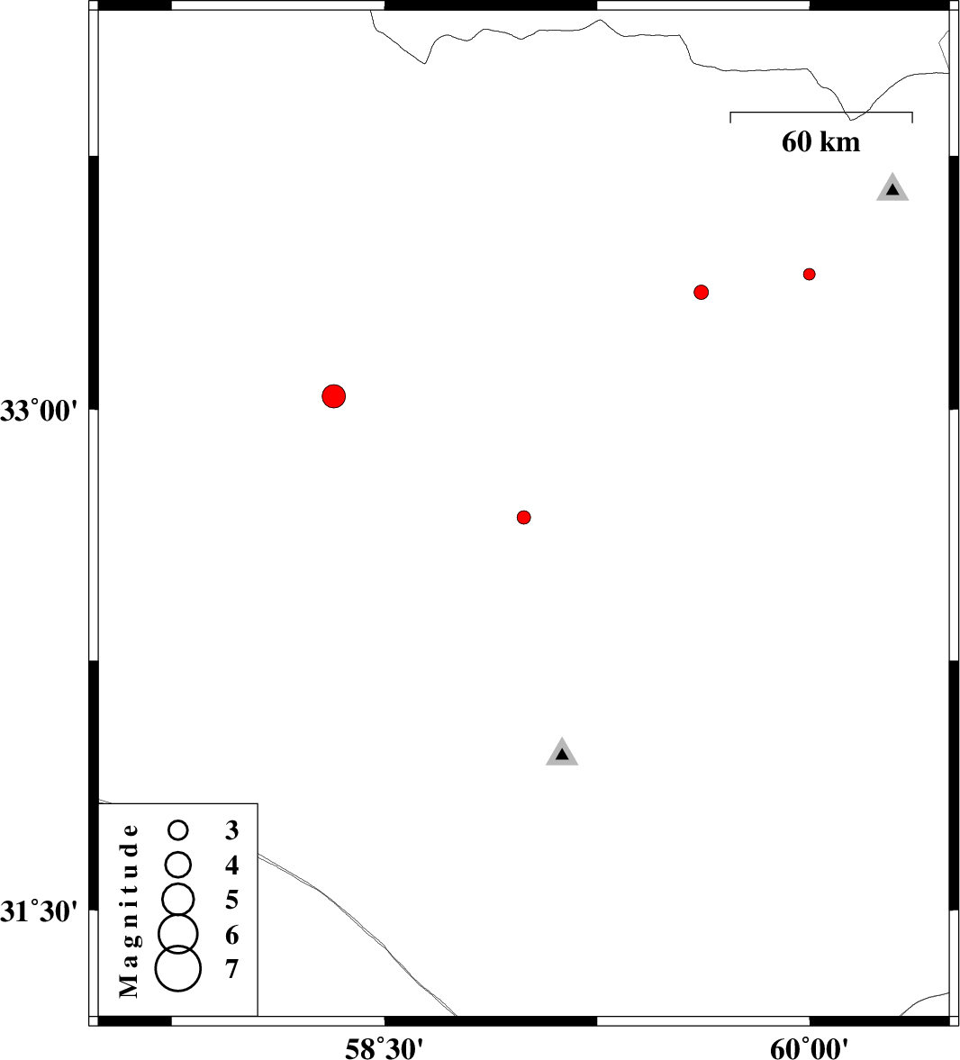 | 2015/09/17 | 06:13:12.4 | 10:43:12.4 | 32.678 | 58.991 | 15 | ML:2.1 | Khorasan(south) Province, 33 km South-West of Birjand | ||