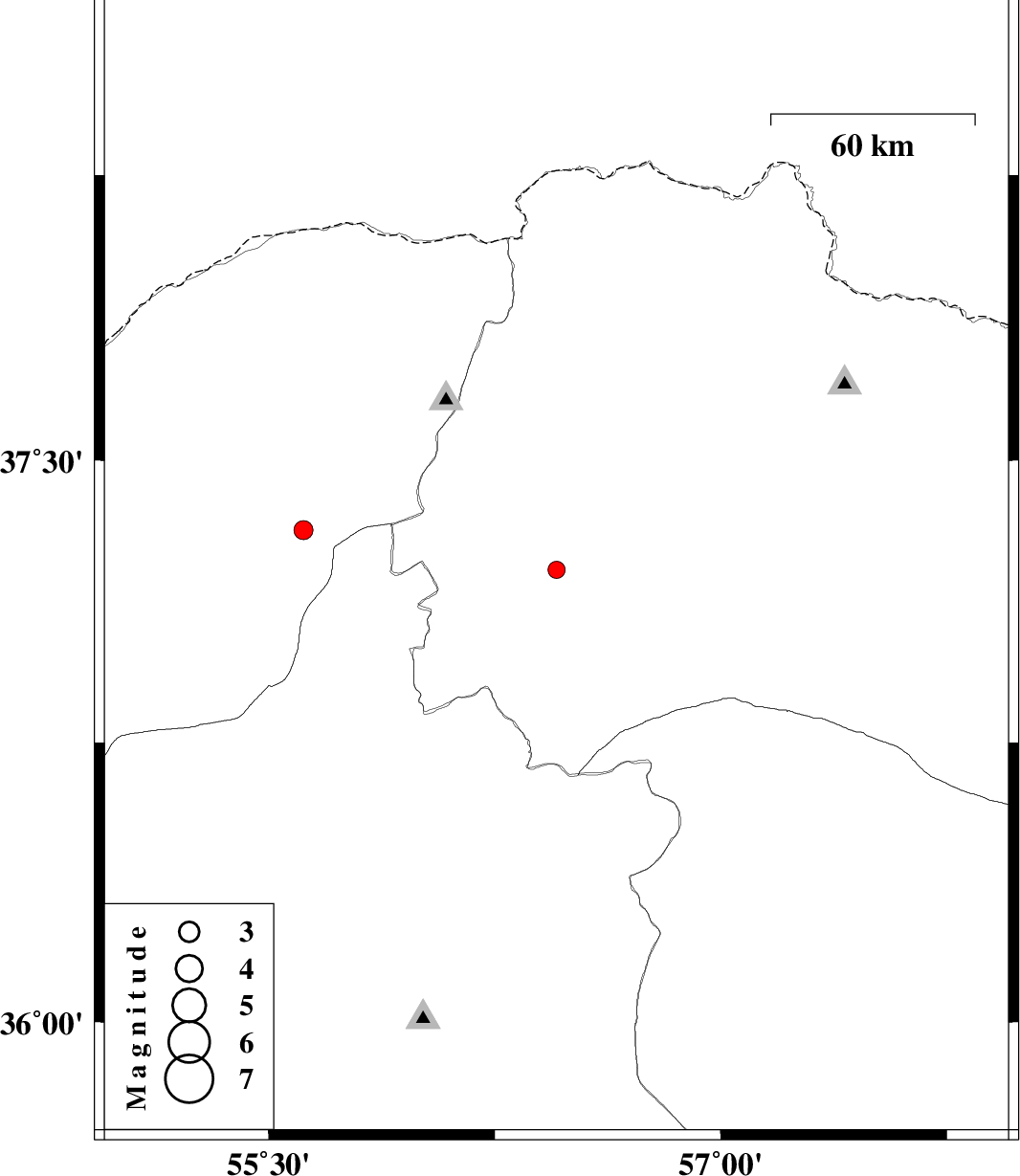 | 2015/09/17 | 19:50:29.6 | 00:20:29.6 | 37.209 | 56.455 | 14 | ML:2.6 | Khorasan(north) Province, 29 km North of Jajarm | ||
