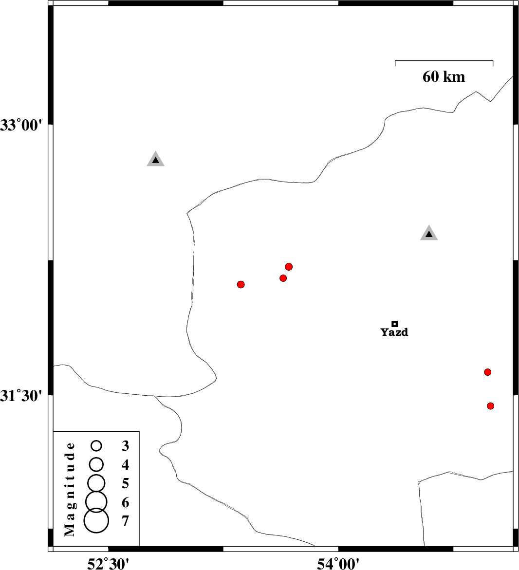 | 2015/09/24 | 11:49:31.9 | 15:19:31.9 | 32.116 | 53.364 | 6 | ML:2.1 | Yazd Province, 63 km South-West of Meybod |