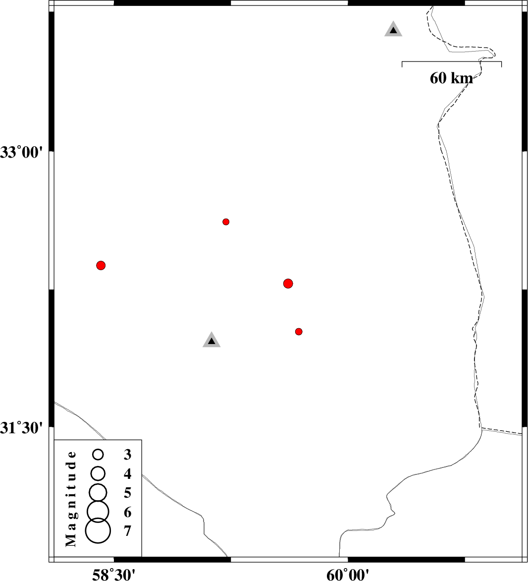 | 2015/10/01 | 22:07:23.6 | 01:37:23.6 | 32.283 | 59.616 | 6 | ML:2.7 | Khorasan(south) Province, 41 km South-West of Sarbisheh | ||