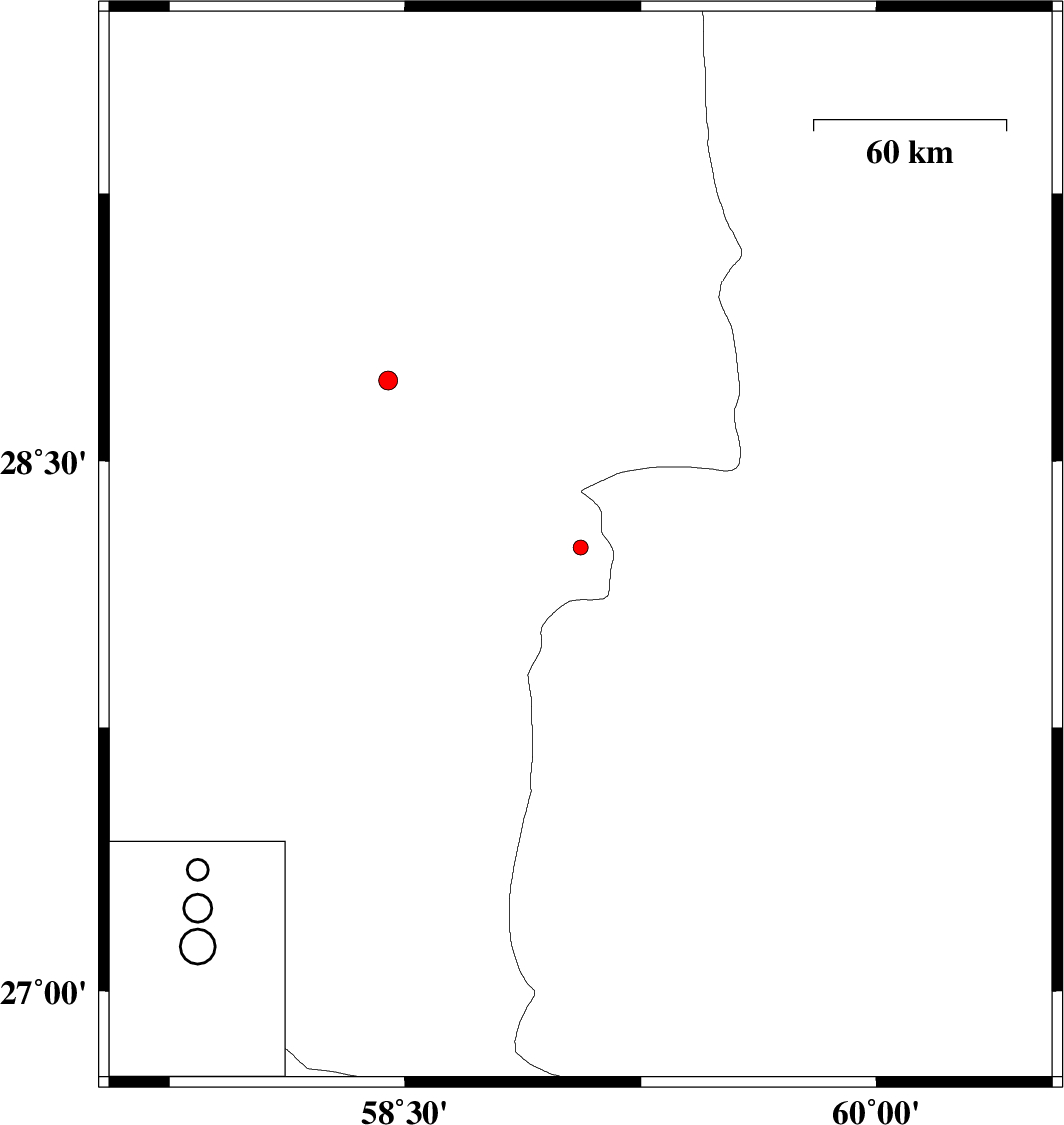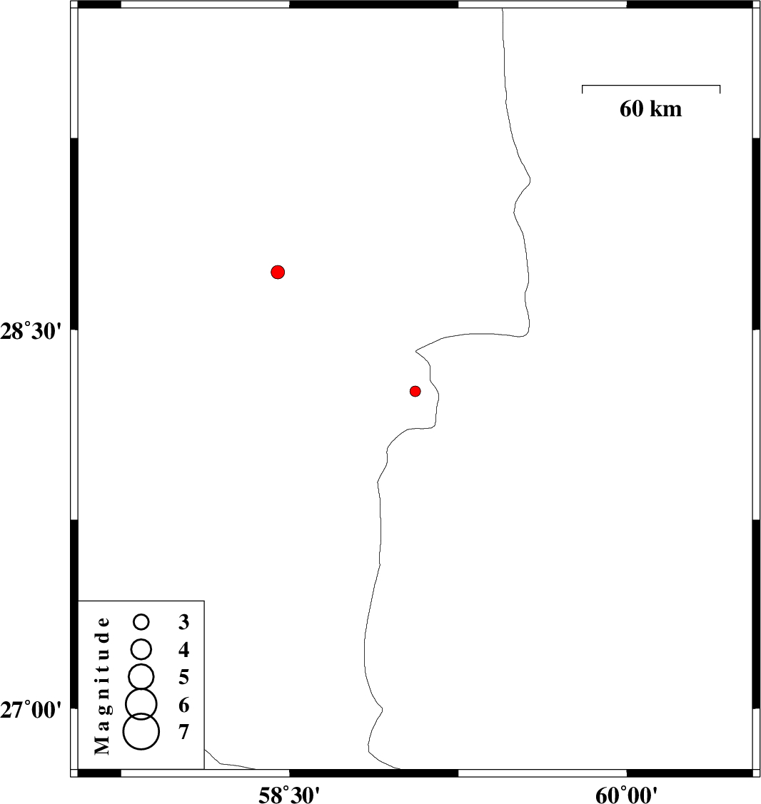 | 2015/10/02 | 03:22:44.0 | 06:52:44.0 | 28.726 | 58.447 | 15 | ML:2.7 | Kerman Province, 43 km South of Bam |