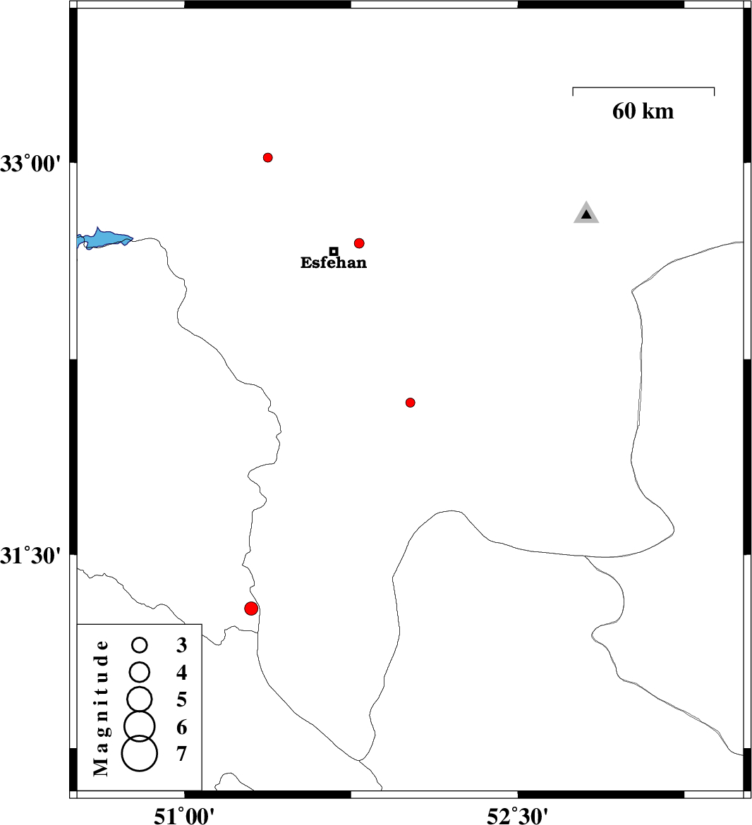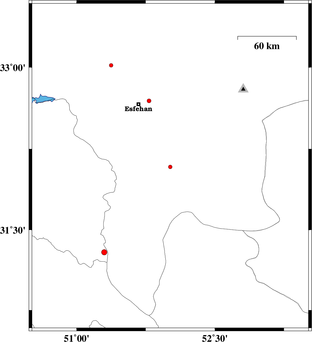 | 2015/09/26 | 06:27:26.6 | 09:57:26.6 | 32.693 | 51.786 | 15 | ML:2 | Esfahan Province, 11 km -East of Esfahan |