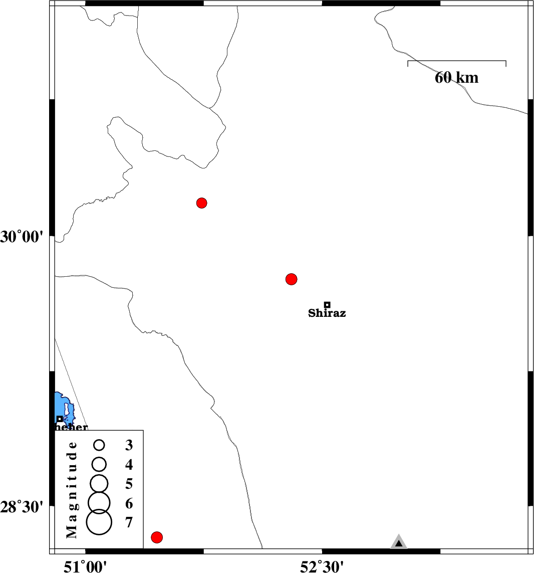 | 2015/10/06 | 03:27:06.4 | 06:57:06.4 | 29.76 | 52.305 | 17 | ML:3.3 | Fars Province, 27 km North-West of Shiraz | ||