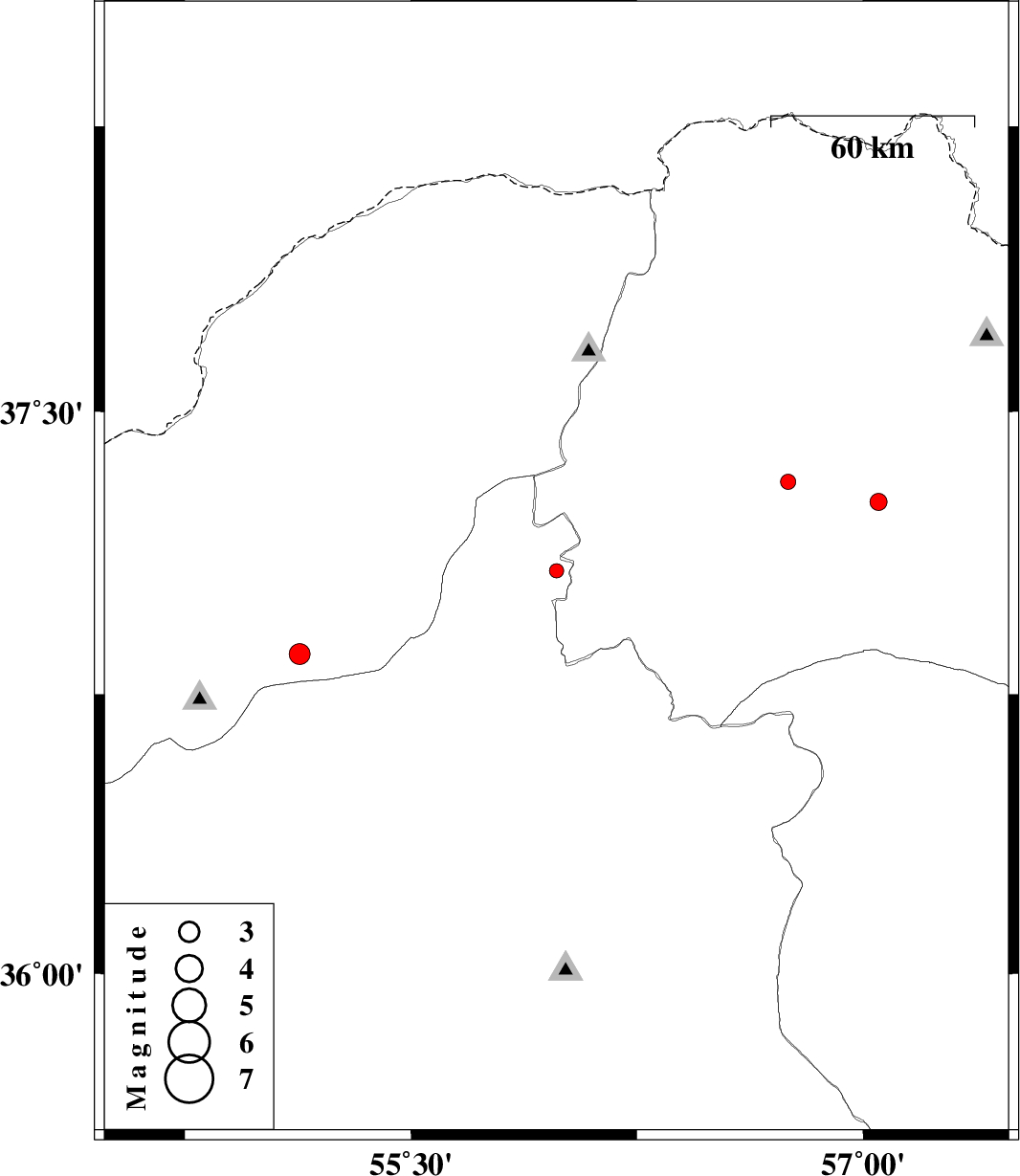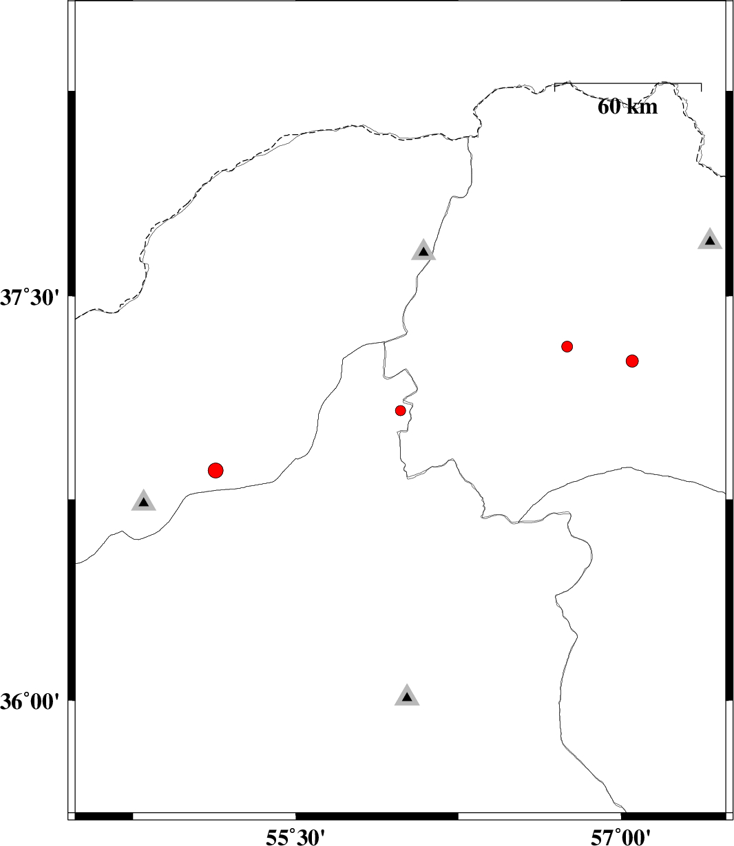 | 2015/09/30 | 16:15:51.0 | 19:45:51.0 | 37.078 | 55.983 | 14 | ML:2.1 | Semnan Province, 39 km North-West of Jajarm | ||