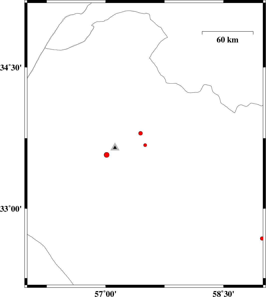 | 2015/09/22 | 09:20:53.8 | 12:50:53.8 | 33.573 | 57.013 | 7 | ML:3 | Yazd Province, 9 km of Tabas | ||