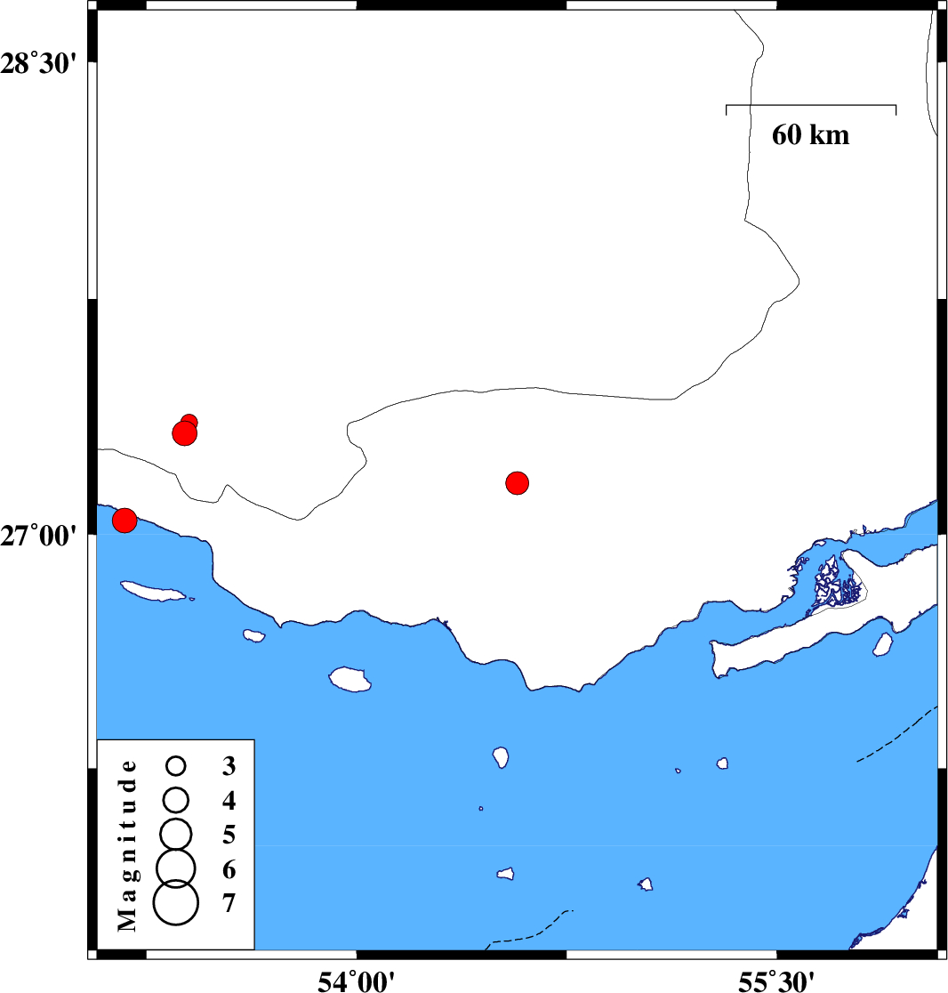 | 2015/10/03 | 16:34:50.1 | 20:04:50.1 | 27.044 | 53.171 | 18 | ML:3.9 | Persian Gulf, 32 km South of Lamerd |