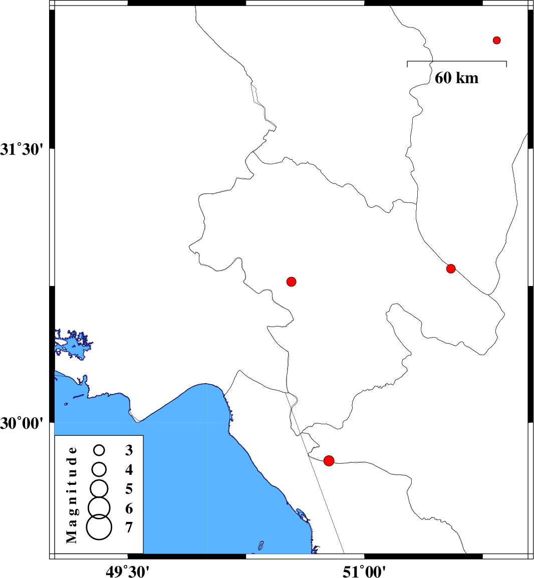 2015/10/17 | 04:15:39.1 | 07:45:39.1 | 29.788 | 50.775 | 14 | ML:2.9 | Fars Province, 35 km North-East of Bandar-e genaveh | ||