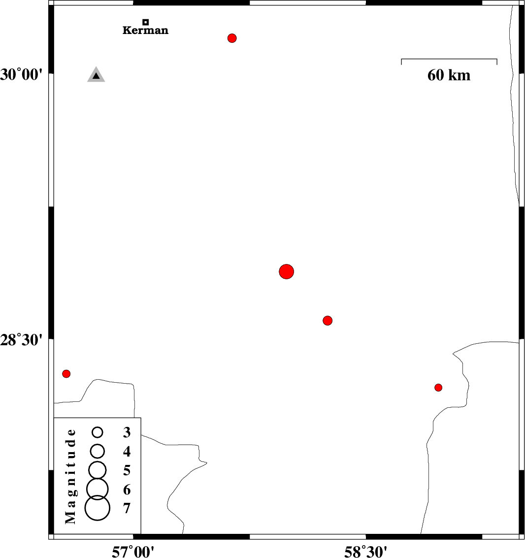 | 2015/10/13 | 01:25:52.2 | 04:55:52.2 | 28.222 | 58.966 | 15 | ML:2.1 | Kerman Province, 115 km South-East of Bam |