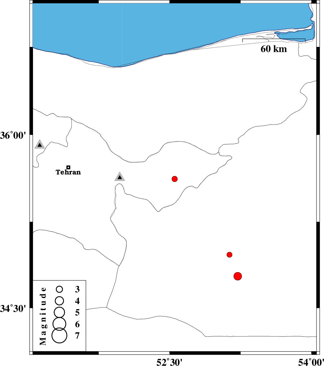 | 2015/10/21 | 13:14:15.2 | 16:44:15.2 | 34.776 | 53.22 | 14 | ML:3.8 | Semnan Province, 89 km South-West of Semnan | ||