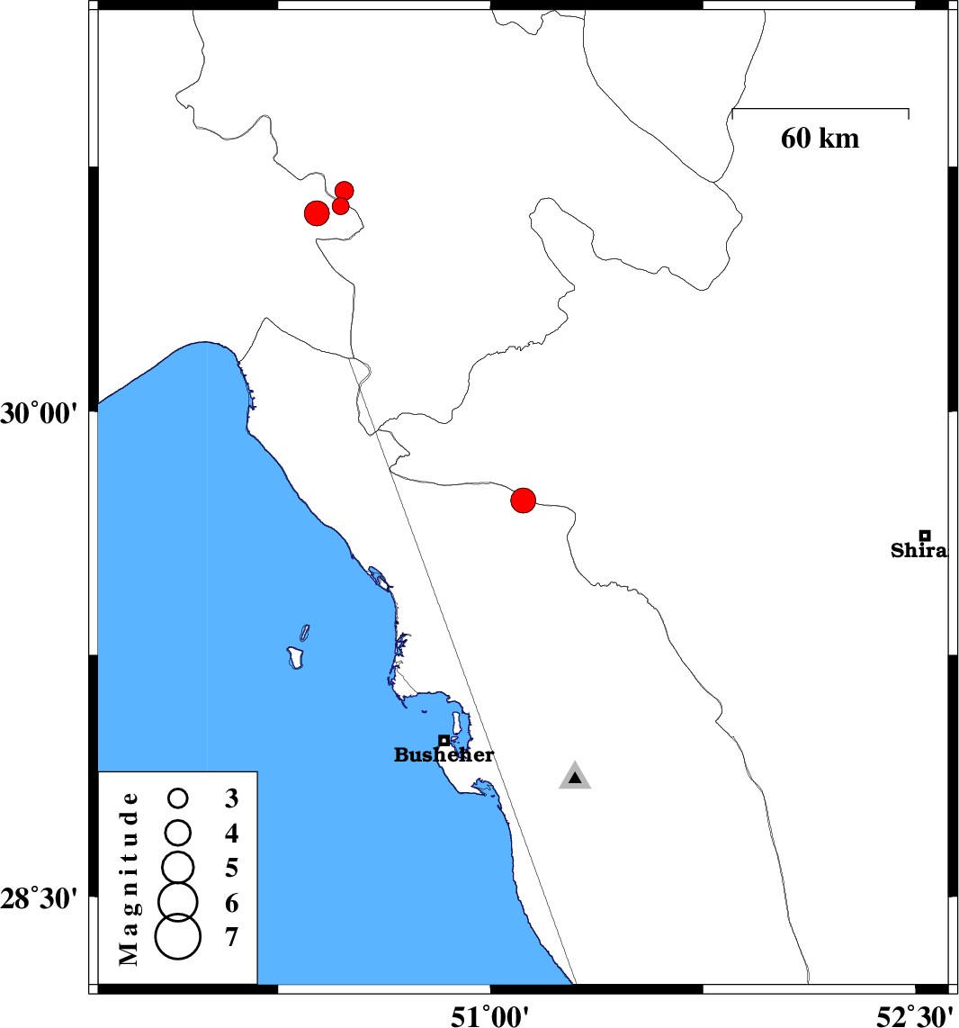 | 2015/10/25 | 14:26:15.5 | 17:56:15.5 | 29.726 | 51.115 | 14 | ML:4 | Bushehr Province, 52 km North of Borazjan | ||