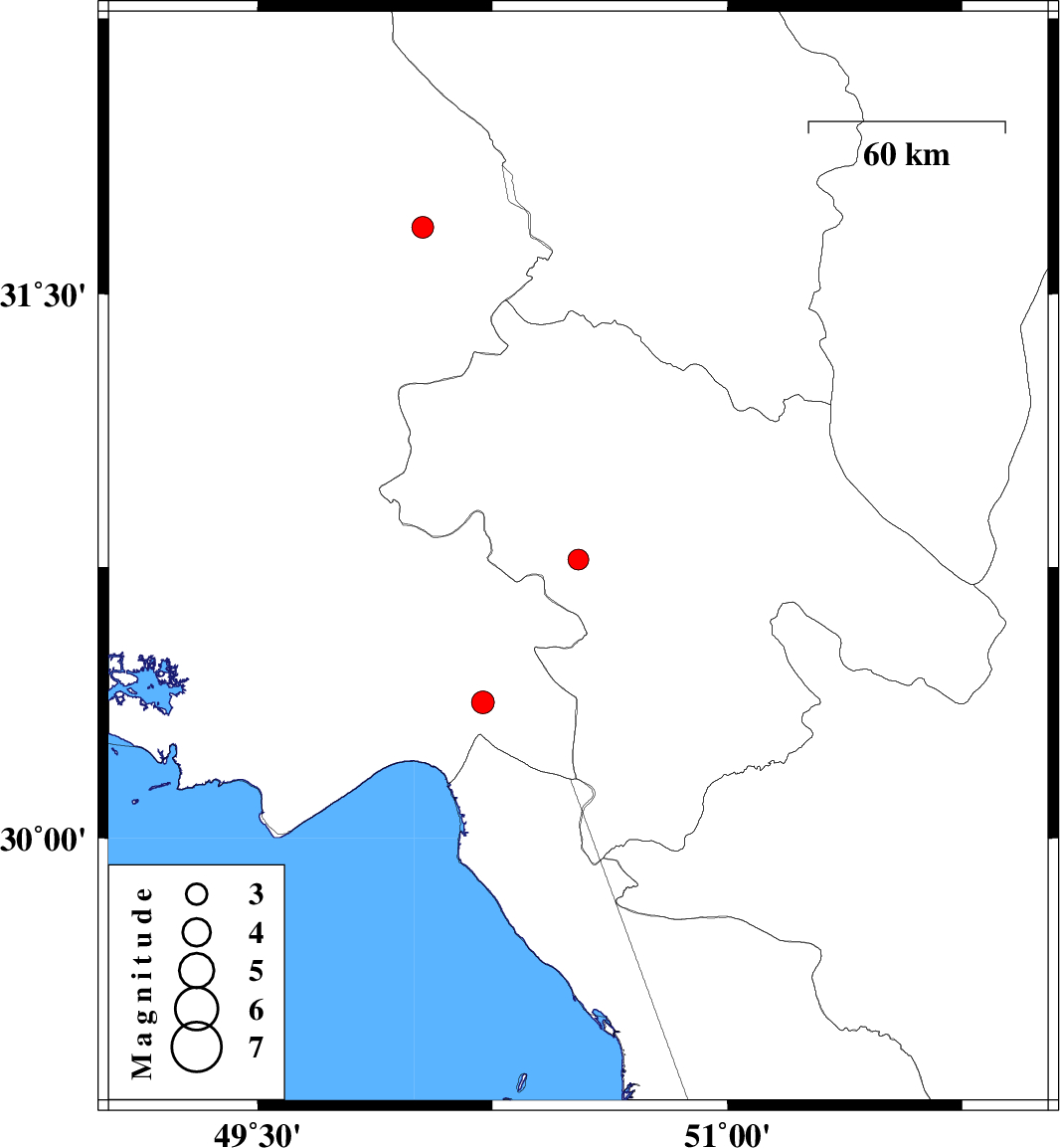 | 2015/11/03 | 03:53:36.1 | 07:23:36.1 | 30.376 | 50.22 | 15 | ML:3.3 | Khoozestan Province, 25 km South of Behbahan | ||