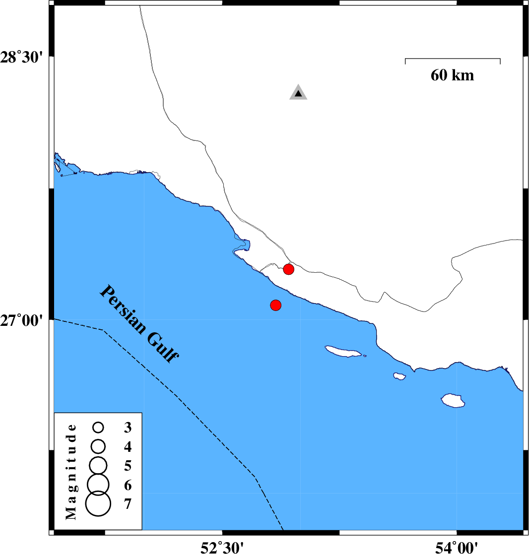 | 2015/11/11 | 11:20:00.4 | 14:50:00.4 | 27.083 | 52.842 | 15 | ML:3.1 | Persian Gulf, 52 km South of Mehr | ||