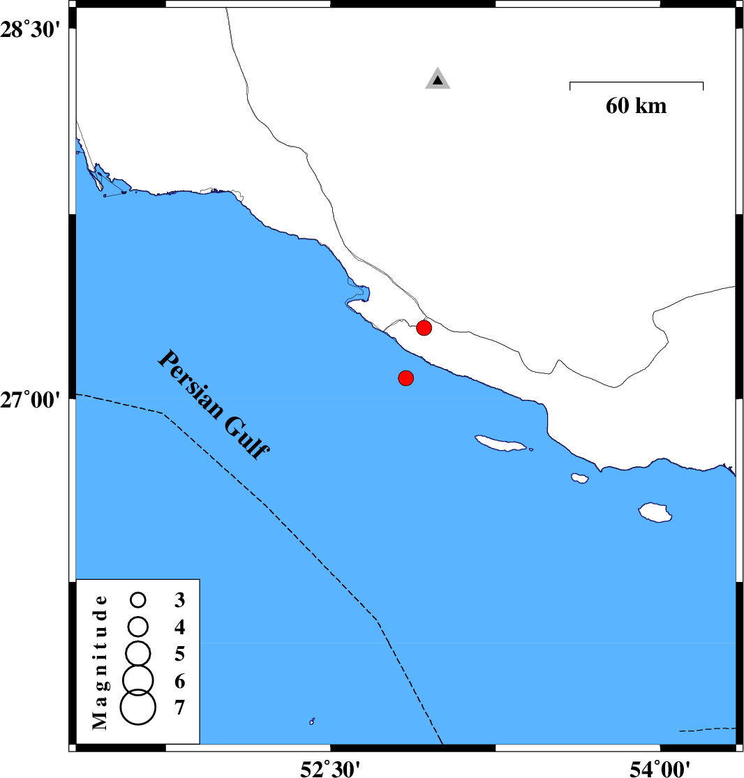 | 2015/11/11 | 11:20:00.4 | 14:50:00.4 | 27.083 | 52.842 | 15 | ML:3.1 | Persian Gulf, 52 km South of Mehr | ||