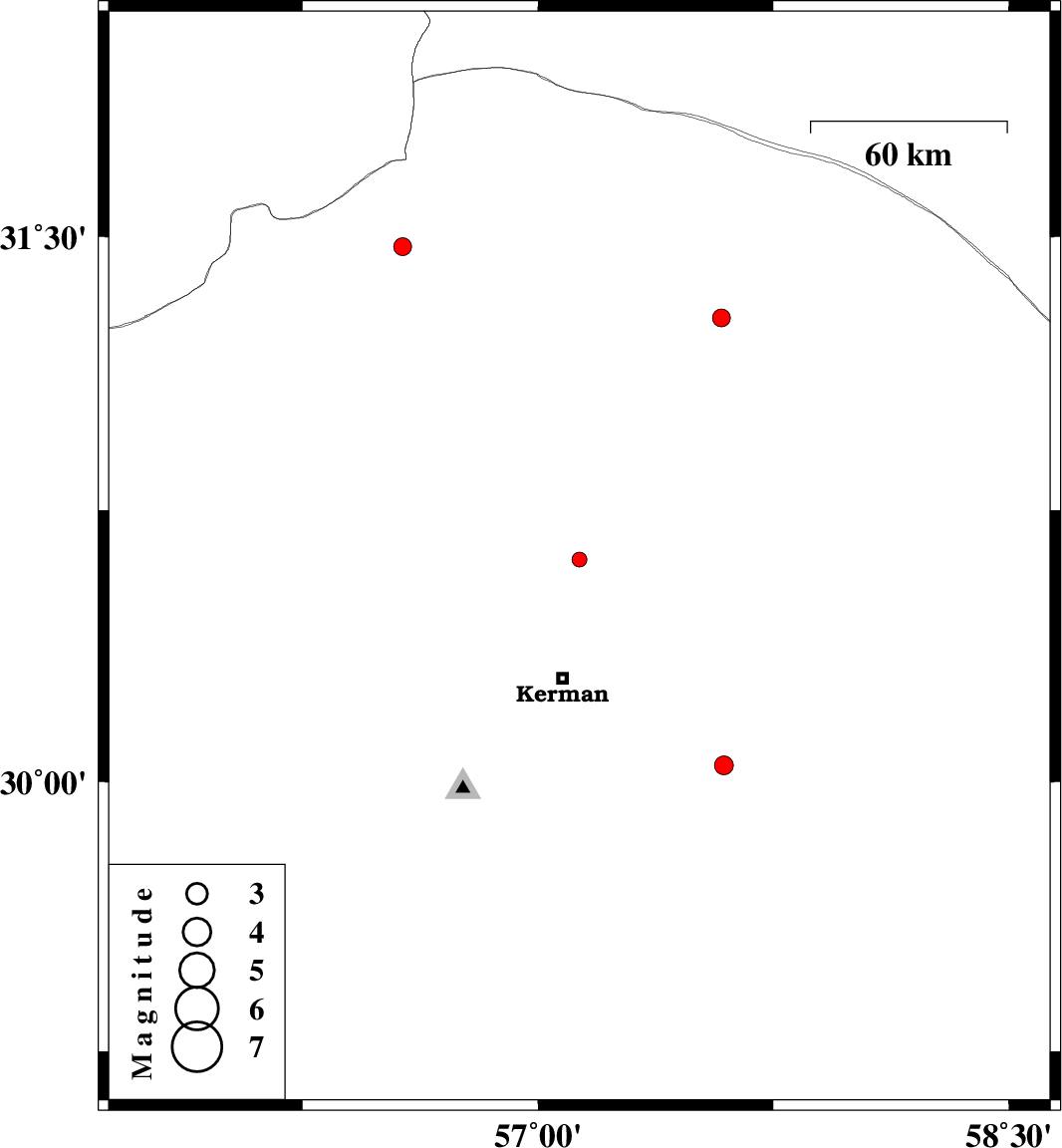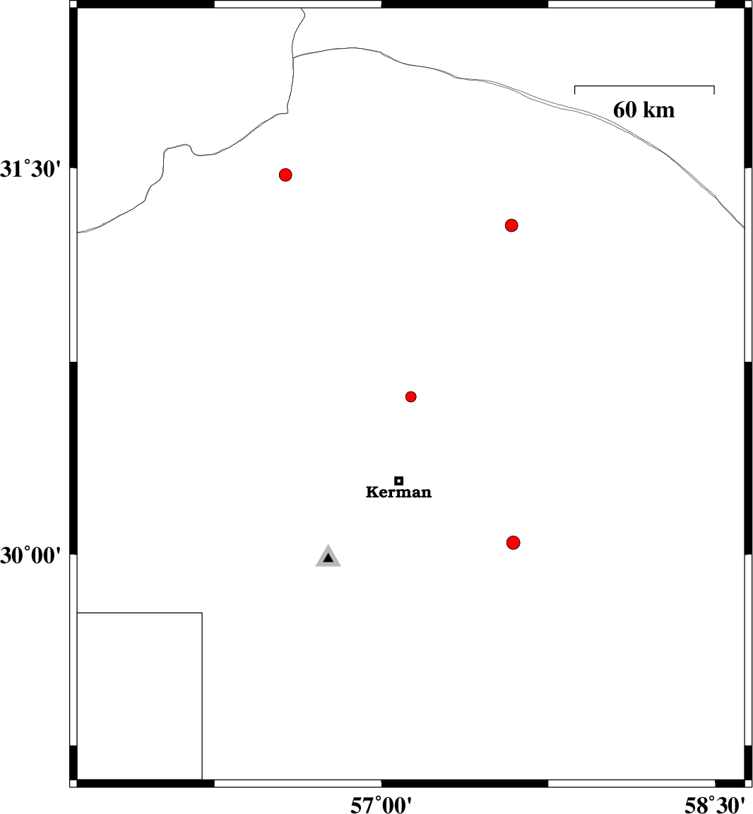 | 2015/11/07 | 17:12:22.5 | 20:42:22.5 | 30.046 | 57.592 | 6 | ML:2.7 | Kerman Province, 56 km South-East of Kerman | ||