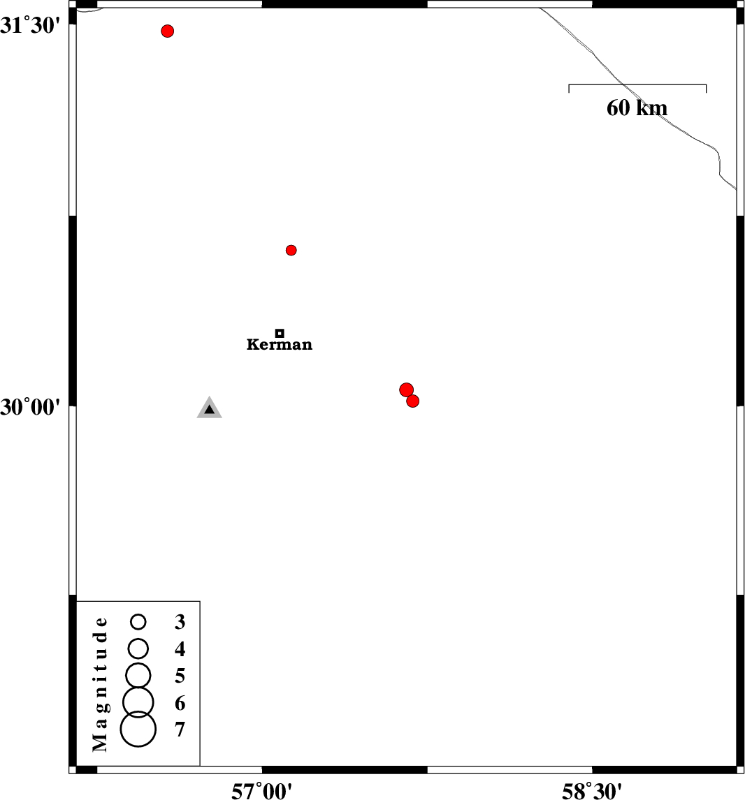 | 2015/11/12 | 08:24:42.0 | 11:54:42.0 | 30.615 | 57.132 | 18 | ML:2.1 | Kerman Province, 37 km North of Kerman | ||