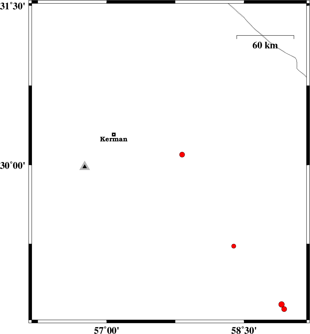 2015/11/12 | 08:24:42.0 | 11:54:42.0 | 30.615 | 57.132 | 18 | ML:2.1 | Kerman Province, 37 km North of Kerman | ||