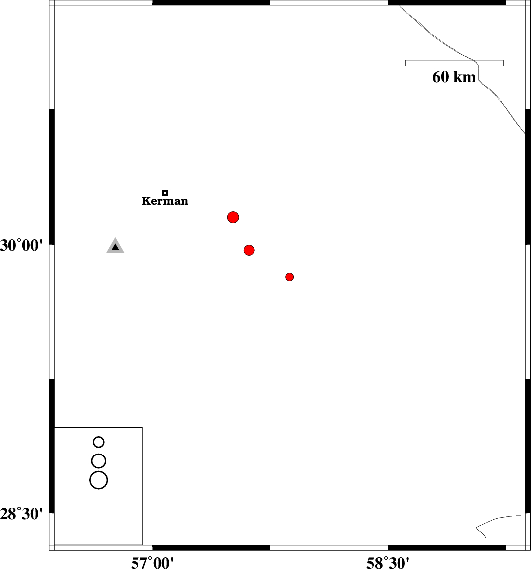 2015/11/19 | 15:01:08.7 | 18:31:08.7 | 29.969 | 57.613 | 14 | ML:3 | Kerman Province, 62 km South-East of Kerman |