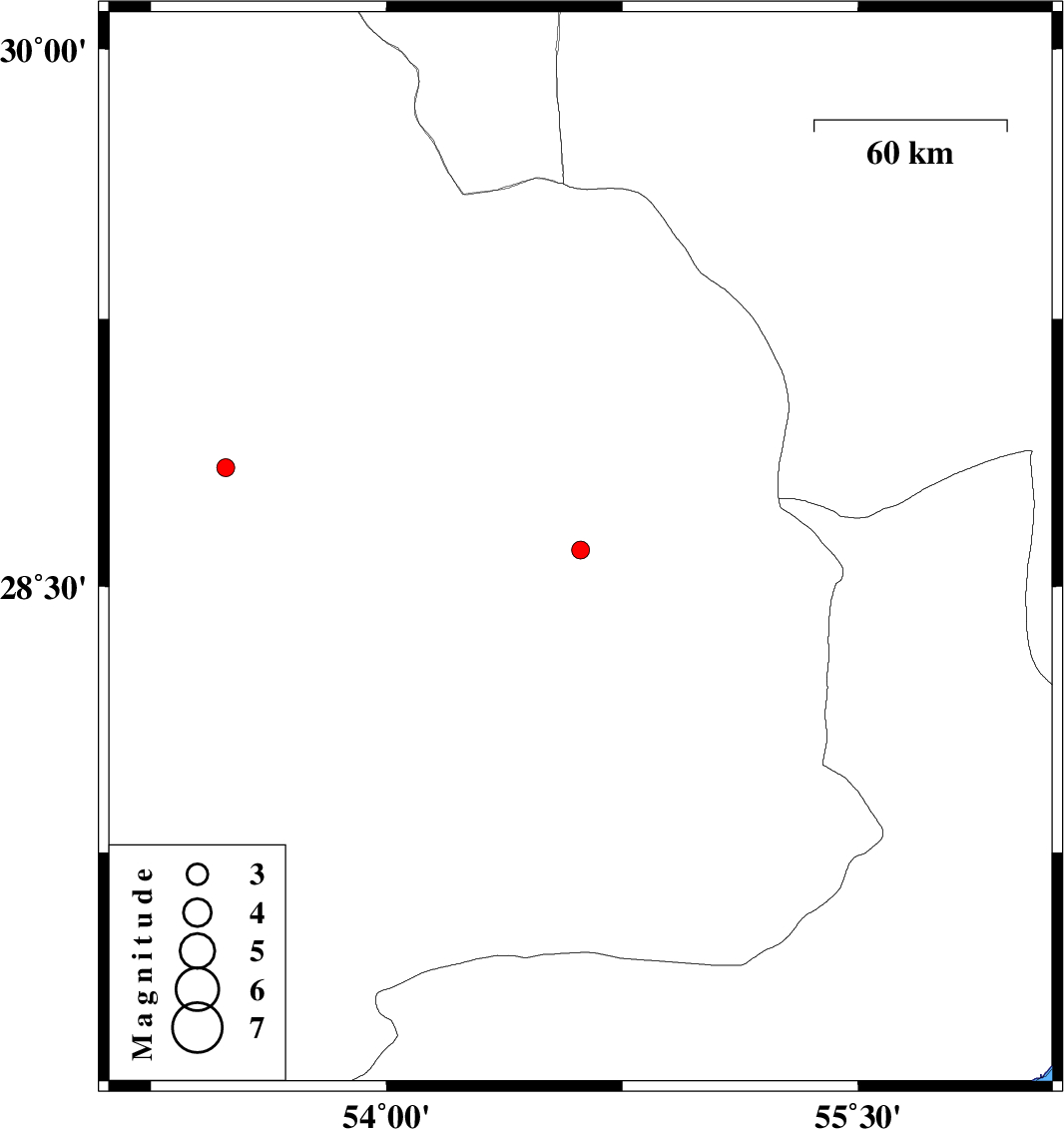 | 2015/11/30 | 07:09:25.7 | 10:39:25.7 | 28.834 | 53.488 | 18 | ML:2.6 | Fars Province, 20 km South-West of Fasa |