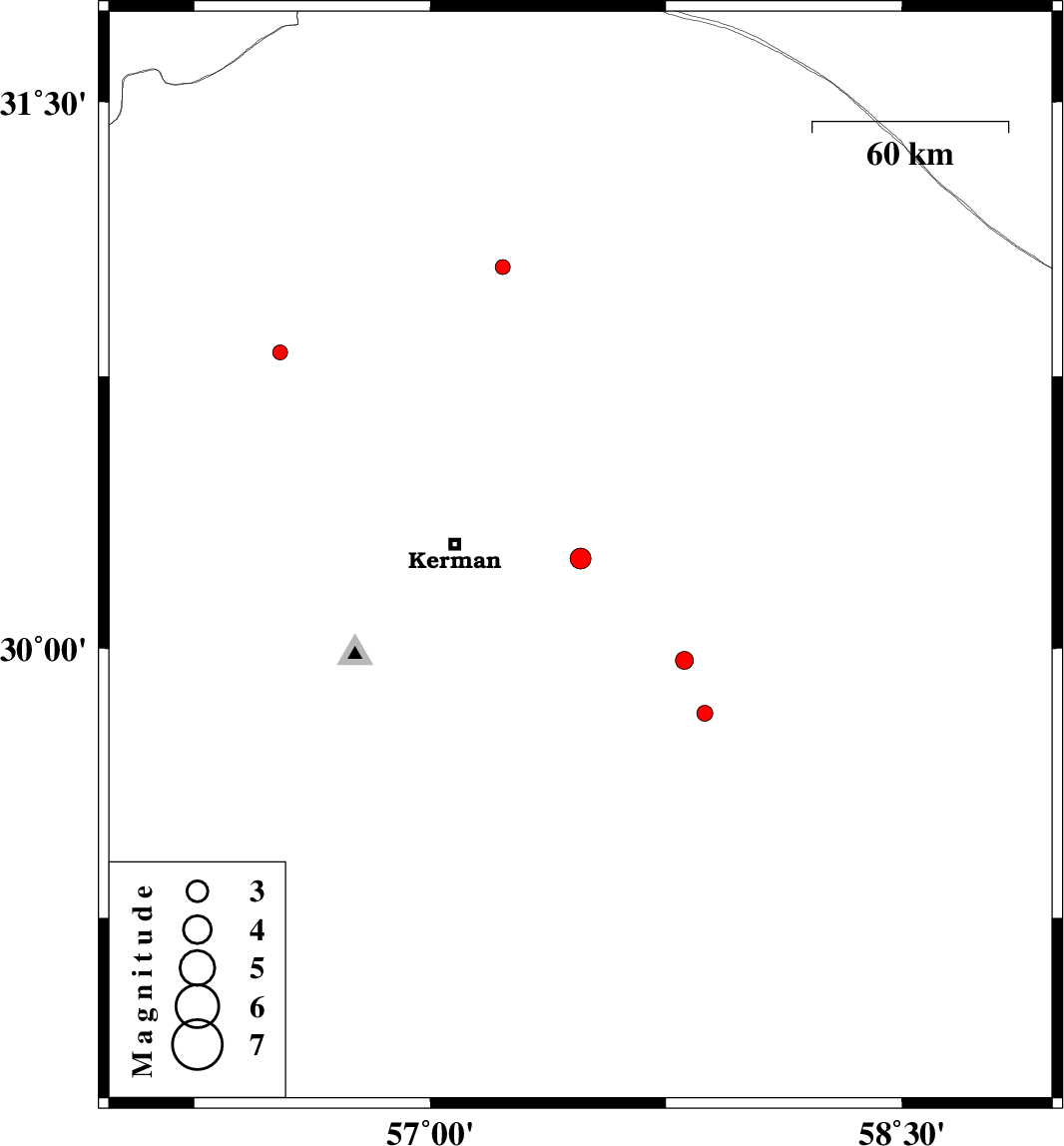 | 2015/11/28 | 06:35:03.8 | 10:05:03.8 | 29.966 | 57.808 | 14 | ML:2.5 | Kerman Province, 79 km South-East of Kerman | ||