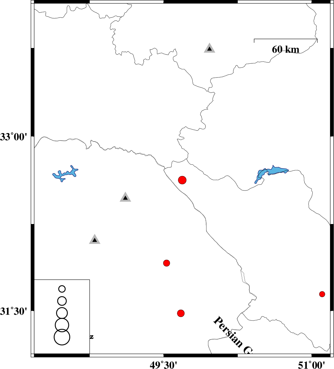| 2015/12/03 | 19:48:37.3 | 23:18:37.3 | 31.478 | 49.674 | 16 | ML:3.2 | Khoozestan Province, 22 km -West of Bagh Malek | ||