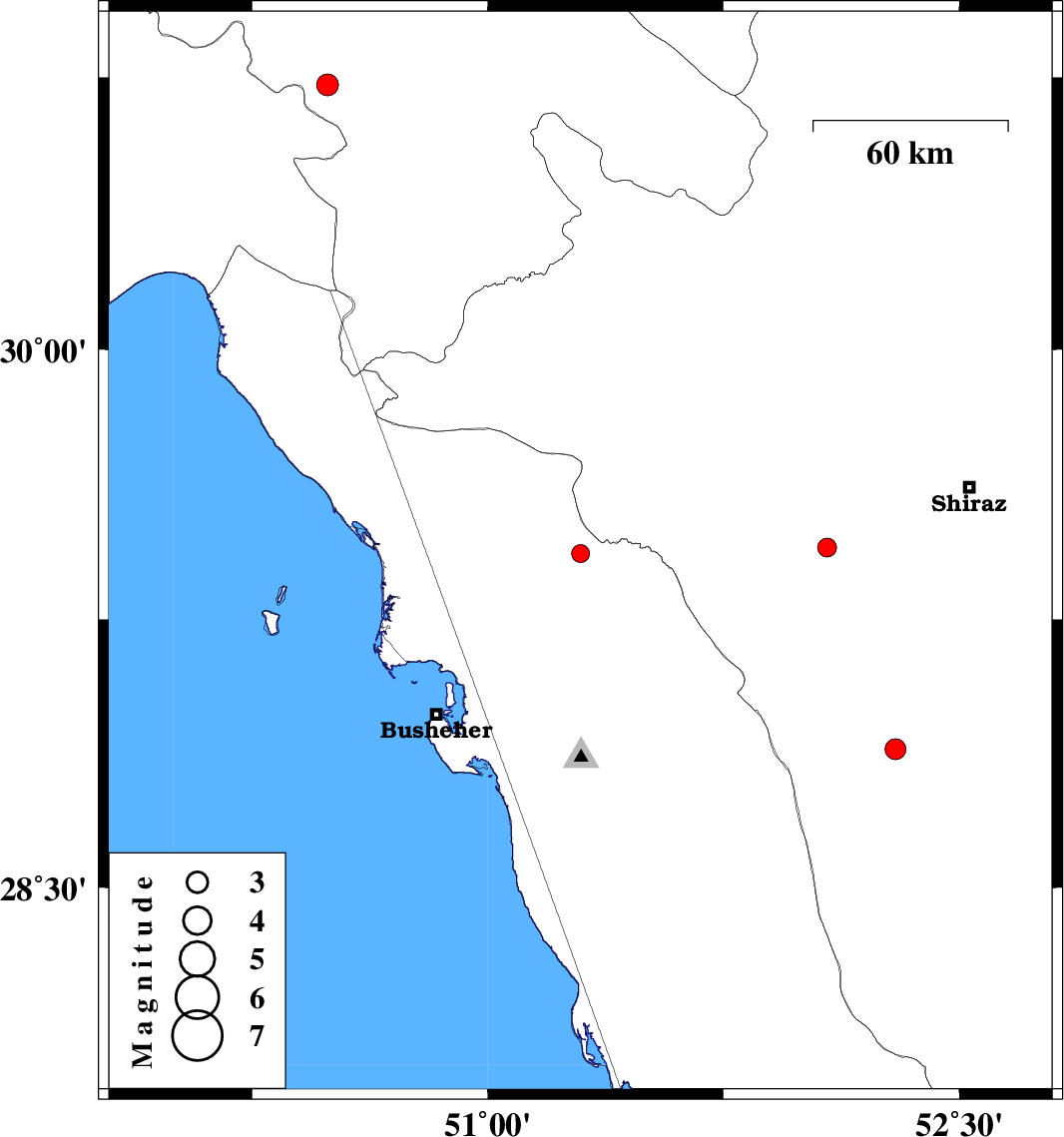 | 2015/12/16 | 04:54:39.0 | 08:24:39.0 | 29.433 | 51.295 | 6 | ML:2.6 | Bushehr Province, 21 km North of Borazjan | ||