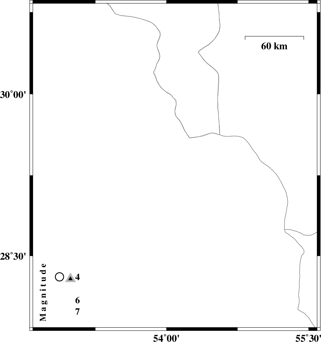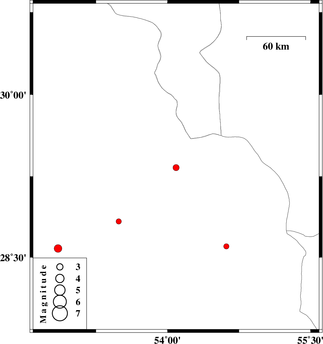 | 2015/11/30 | 07:09:25.7 | 10:39:25.7 | 28.834 | 53.488 | 18 | ML:2.6 | Fars Province, 20 km South-West of Fasa | ||