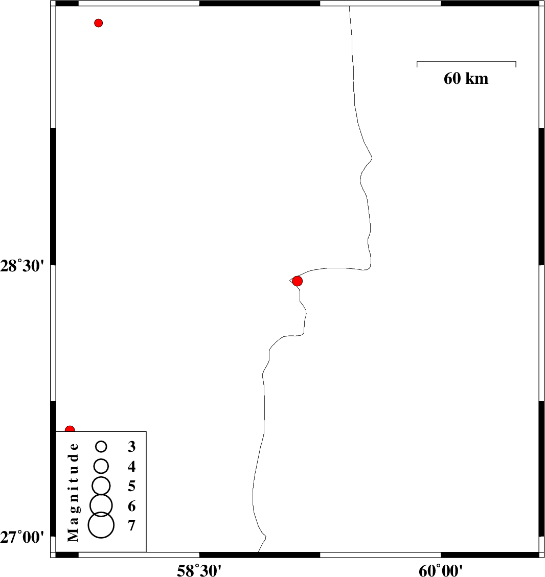 | 2015/11/26 | 22:46:46.8 | 02:16:46.8 | 27.588 | 57.695 | 14 | ML:2.7 | Kerman Province, 40 km South of Kahnuj | ||