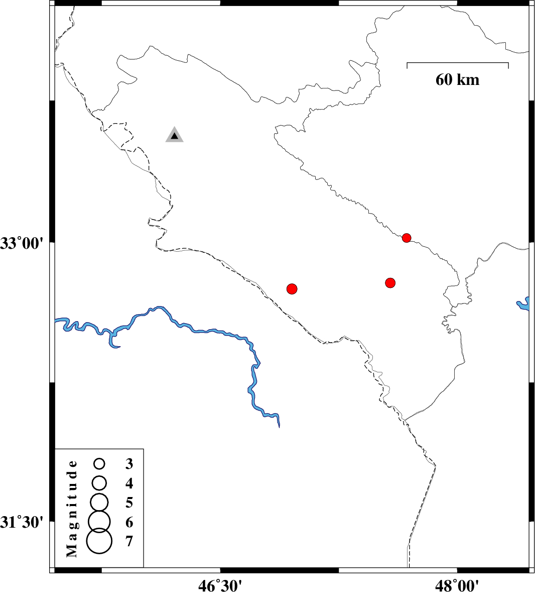 | 2015/12/15 | 11:24:12.3 | 14:54:12.3 | 33.022 | 47.679 | 18 | ML:2.5 | Lorestan Province, 15 km South of Pol-e dokhtar |