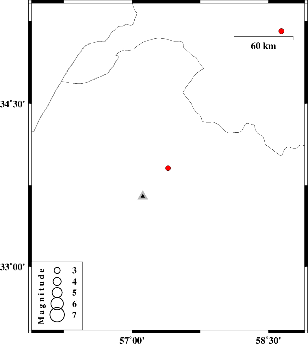2015/12/27 | 06:24:51.4 | 09:54:51.4 | 33.91 | 57.396 | 20 | ML:2.5 | Khorasan(center) Province, 56 km North-East of Tabas | ||