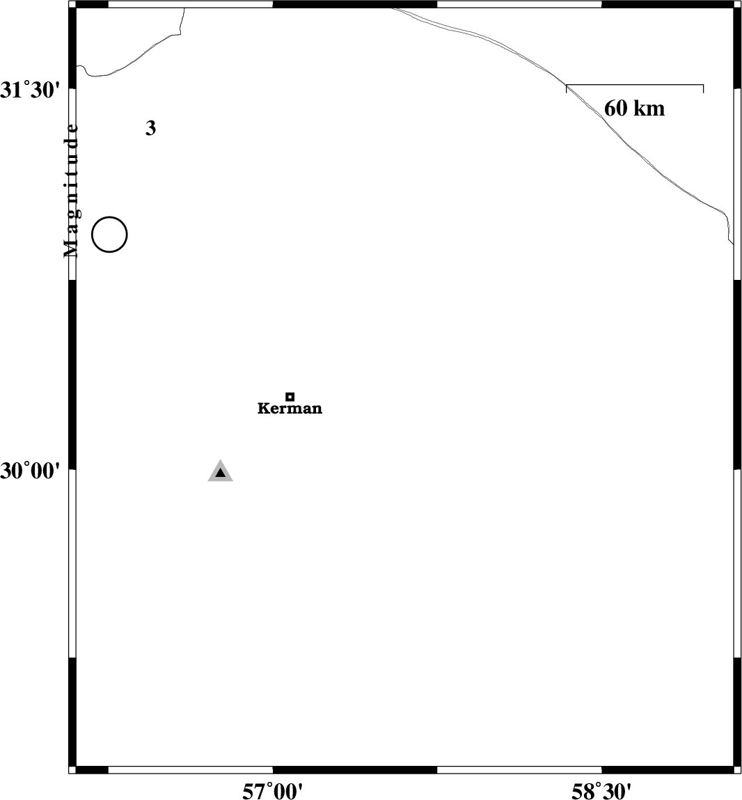 2015/12/28 | 13:22:36.8 | 16:52:36.8 | 30.315 | 57.602 | 14 | ML:2.7 | Kerman Province, 50 km -East of Kerman | ||