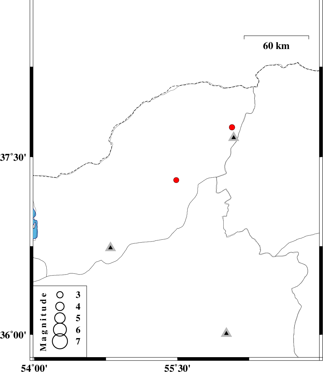| 2015/12/20 | 03:41:20.3 | 07:11:20.3 | 37.747 | 56.072 | 14 | ML:2.7 | Golestan Province, 65 km North-East of Kalaleh |