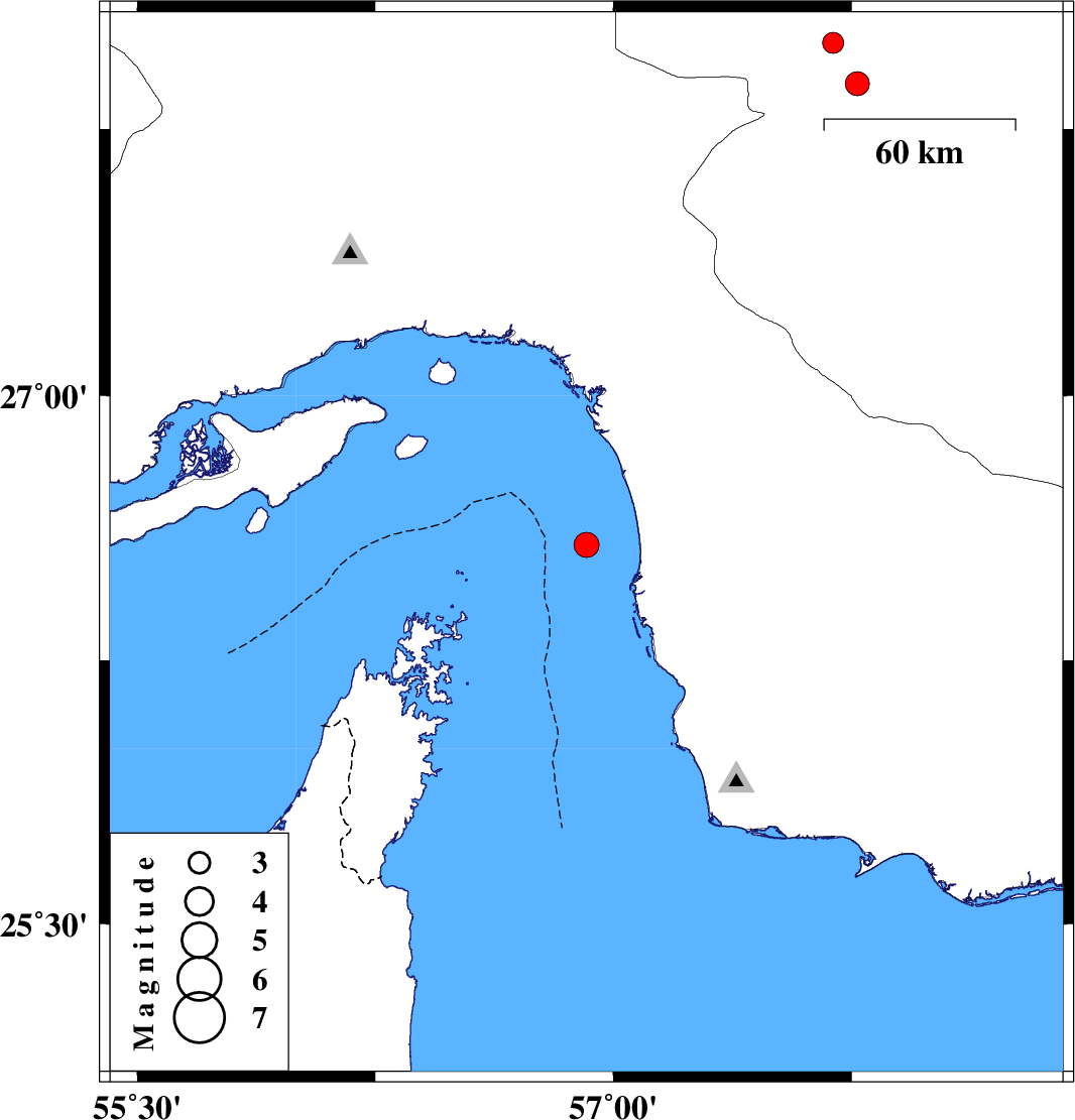 | 2015/12/31 | 11:27:36.0 | 14:57:36.0 | 26.578 | 56.915 | 16 | ML:3.5 | Oman Sea, 65 km South-West of Minab | ||