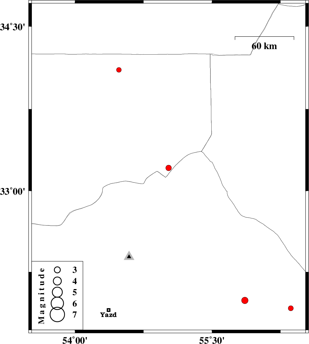 | 2016/01/04 | 09:35:52.3 | 13:05:52.3 | 31.985 | 55.86 | 14 | ML:3.2 | Yazd Province, 61 km North-East of Bafq | ||
