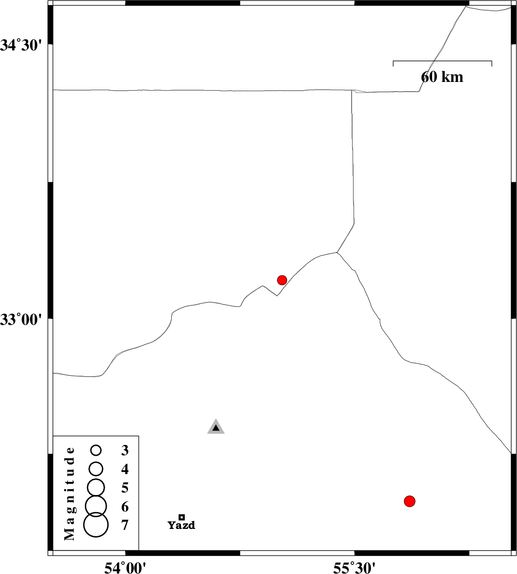 | 2016/01/04 | 09:35:52.3 | 13:05:52.3 | 31.985 | 55.86 | 14 | ML:3.2 | Yazd Province, 61 km North-East of Bafq |