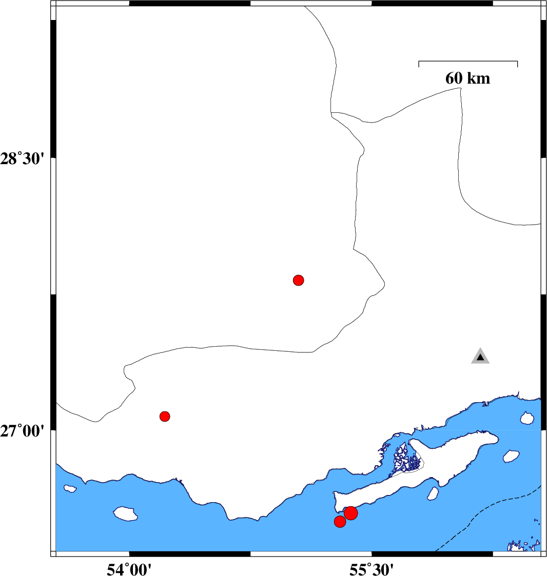 | 2016/01/04 | 03:05:46.2 | 06:35:46.2 | 26.538 | 55.37 | 15 | ML:3.8 | Persian Gulf, 52 km -East of Bandar-e lengeh | ||