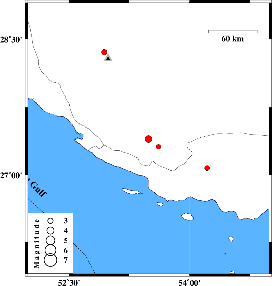| 2016/01/05 | 18:05:49.8 | 21:35:49.8 | 27.076 | 54.219 | 17 | ML:2.8 | Hormozgan Province, 20 km South-West of Bastak | ||