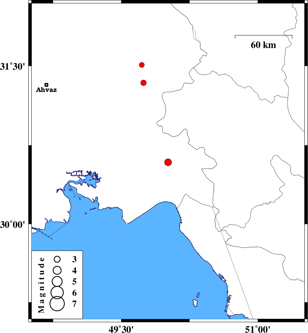 | 2016/01/09 | 05:45:51.3 | 09:15:51.3 | 31.34 | 49.744 | 14 | ML:2.8 | Khoozestan Province, 15 km -East of Ramhormoz |