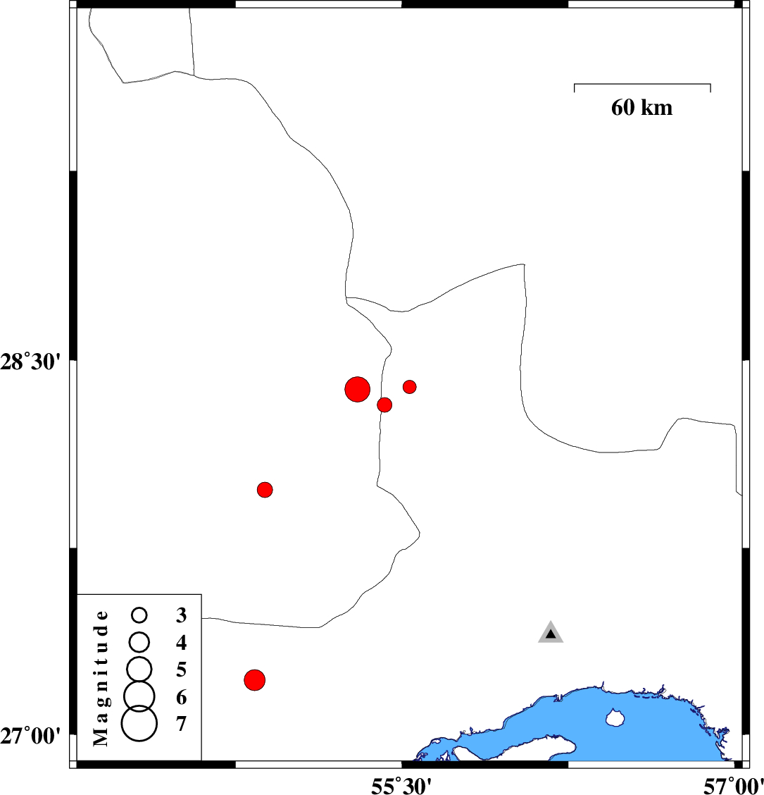 | 2016/01/18 | 07:50:52.6 | 11:20:52.6 | 27.982 | 54.881 | 18 | ML:3.1 | Fars Province, 63 km North-East of Lar |