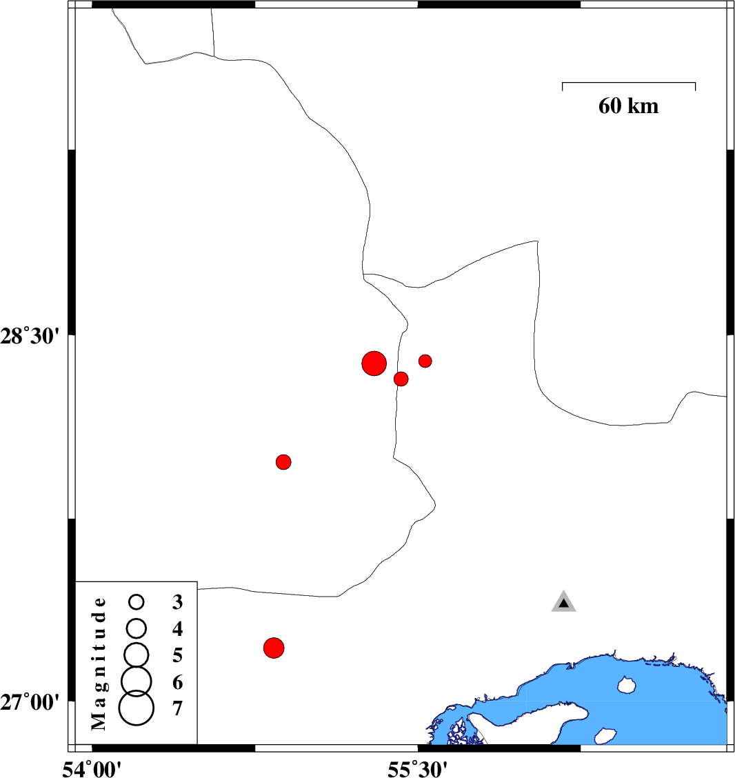 | 2016/01/18 | 07:50:52.6 | 11:20:52.6 | 27.982 | 54.881 | 18 | ML:3.1 | Fars Province, 63 km North-East of Lar |