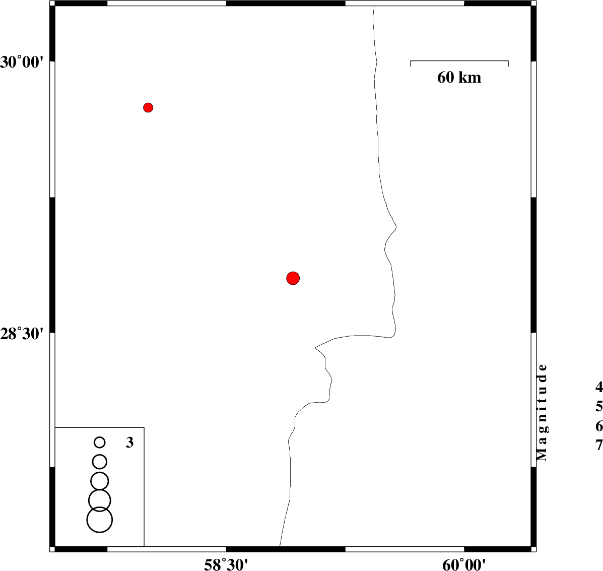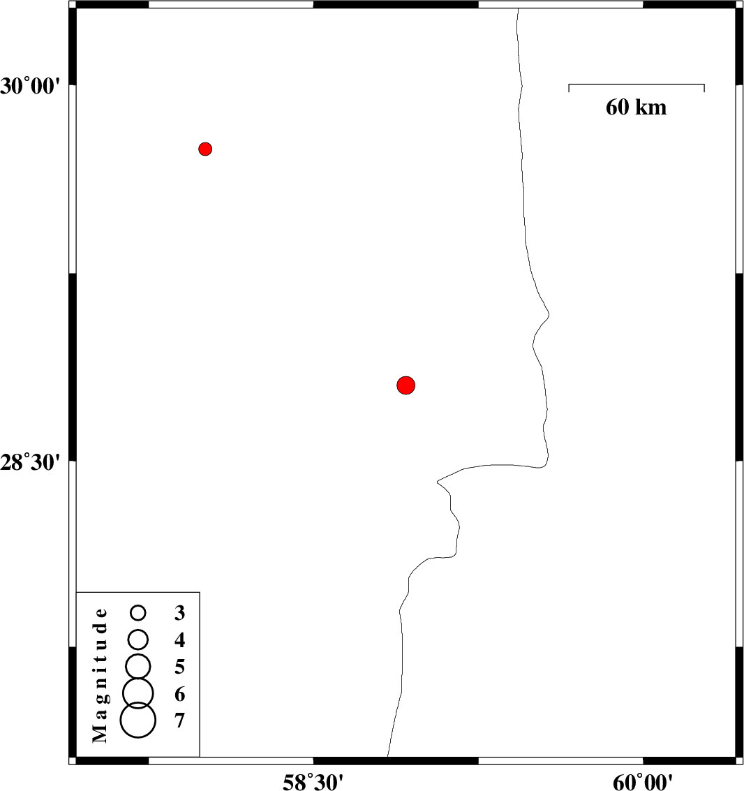 | 2016/01/24 | 23:20:38.7 | 02:50:38.7 | 28.803 | 58.92 | 29 | ML:3.7 | Kerman Province, 64 km South-East of Bam | ||