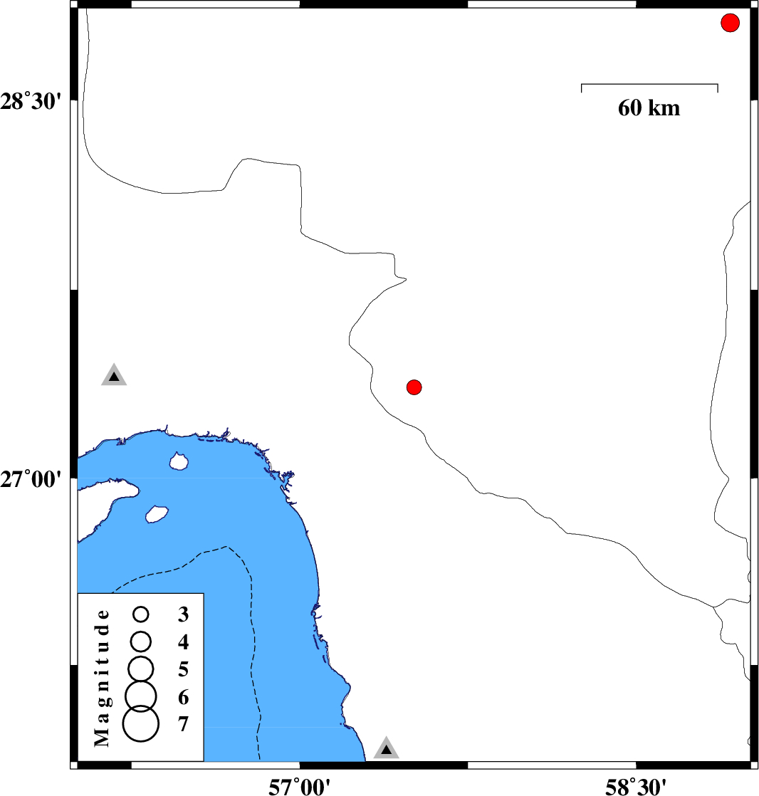 | 2016/01/25 | 19:48:06.2 | 23:18:06.2 | 27.362 | 57.51 | 15 | ML:2.9 | Kerman Province, 6 km of Manujan | ||