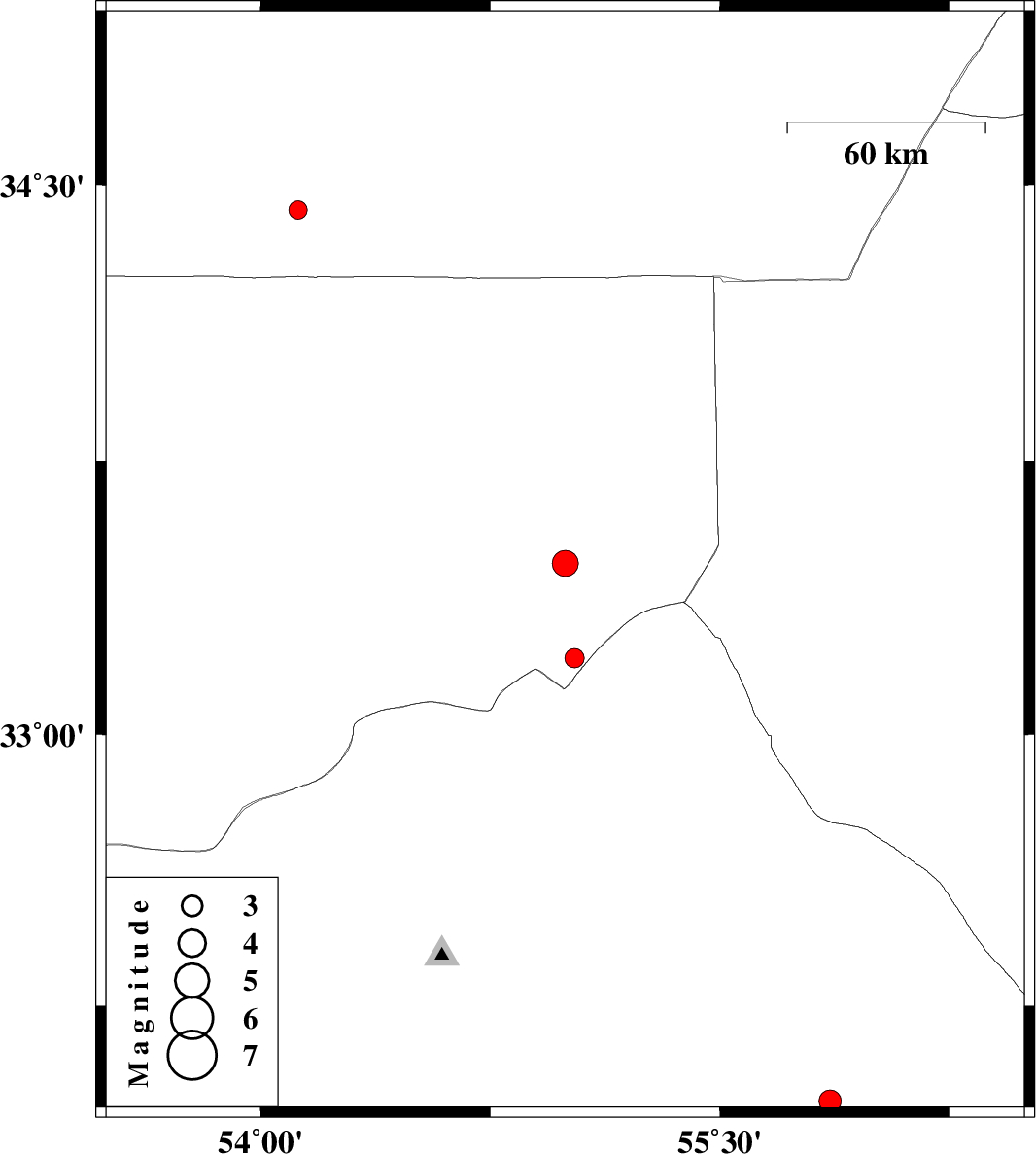 | 2016/01/04 | 09:35:52.3 | 13:05:52.3 | 31.985 | 55.86 | 14 | ML:3.2 | Yazd Province, 61 km North-East of Bafq |