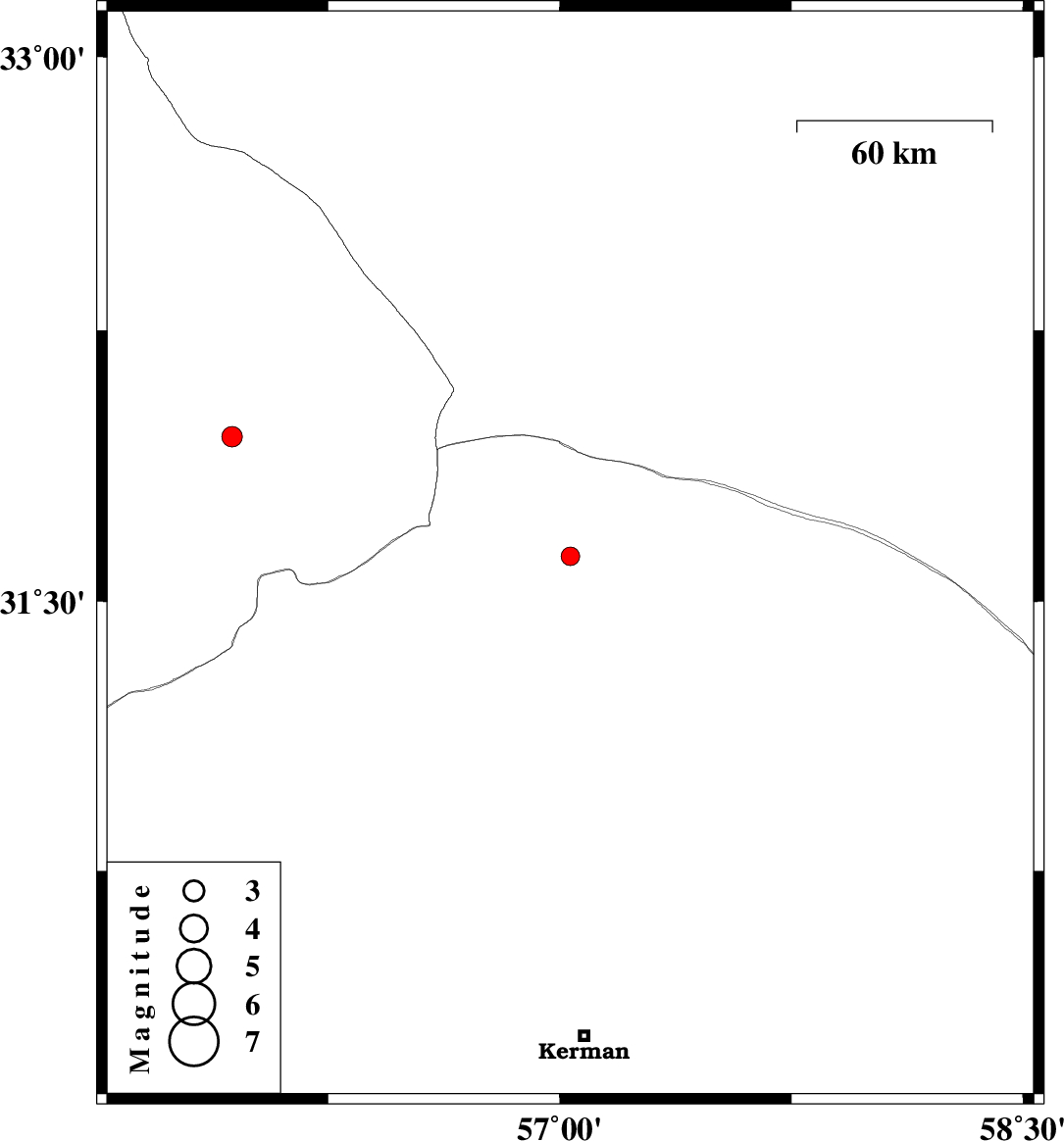 | 2016/01/27 | 10:29:24.3 | 13:59:24.3 | 31.956 | 55.939 | 14 | ML:2.9 | Yazd Province, 64 km North-East of Bafq |