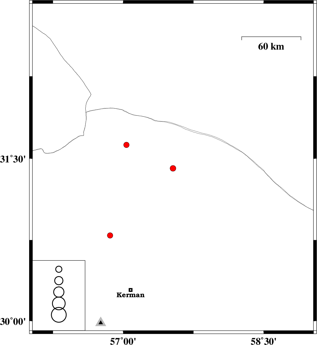 | 2016/02/10 | 00:10:31.7 | 03:40:31.7 | 31.41 | 57.531 | 16 | ML:2.8 | Kerman Province, 70 km North-East of Ravar | ||