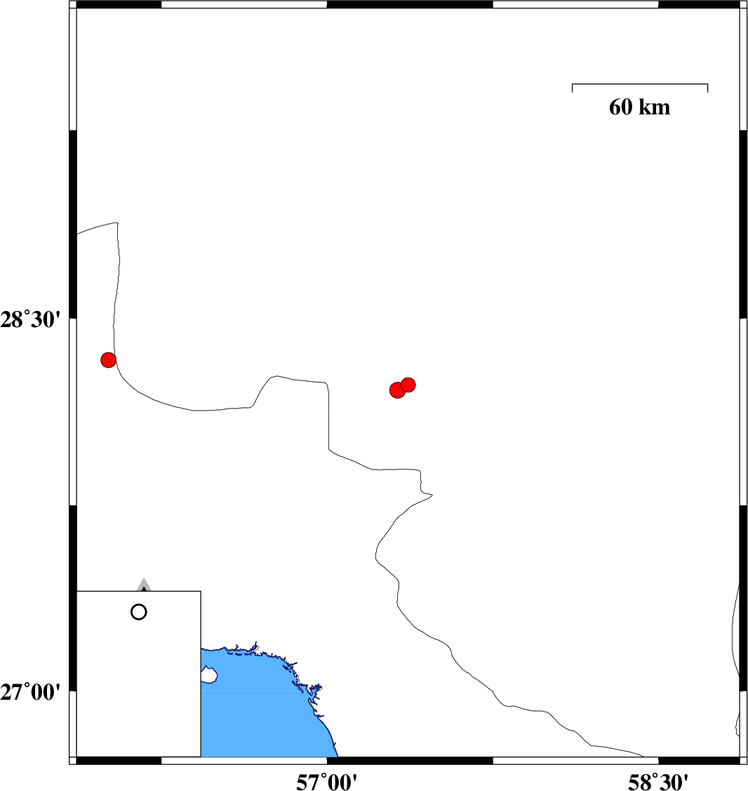 | 2016/02/13 | 15:27:43.6 | 18:57:43.6 | 28.233 | 57.366 | 14 | ML:2.9 | Kerman Province, 45 km North-West of Kahnuj | ||