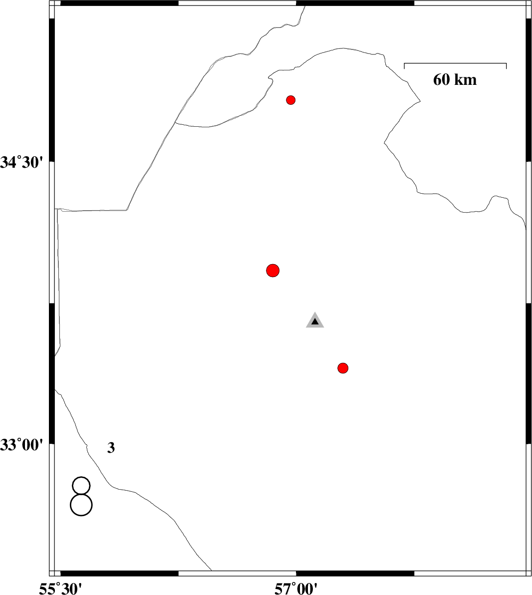 | 2016/02/10 | 22:24:02.2 | 01:54:02.2 | 33.297 | 57.407 | 15 | ML:2.9 | Yazd Province, 56 km South-East of Tabas | ||