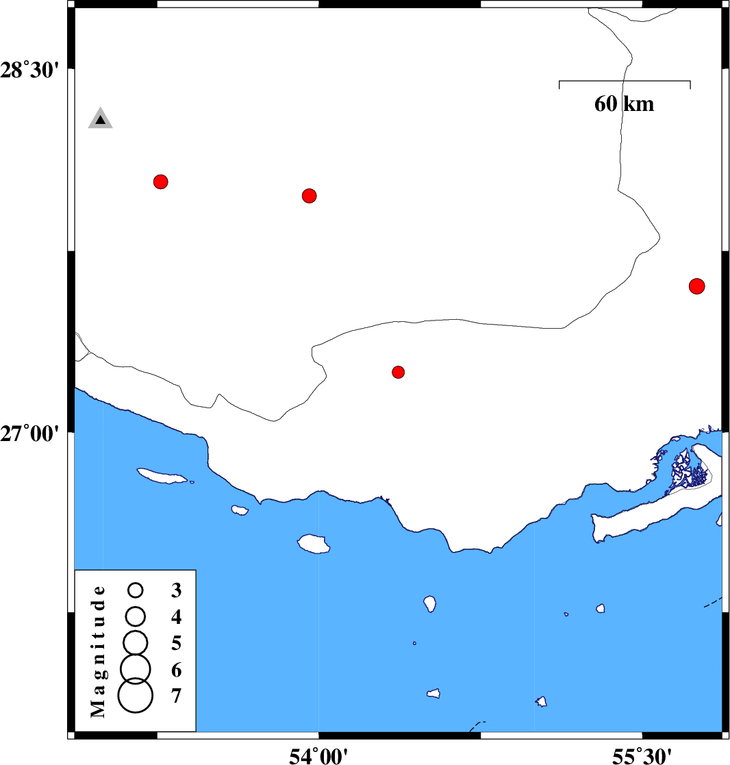 | 2016/02/20 | 03:38:13.0 | 07:08:13.0 | 27.605 | 55.752 | 15 | ML:3.3 | Hormozgan Province, 80 km South-West of Hajiabad | ||