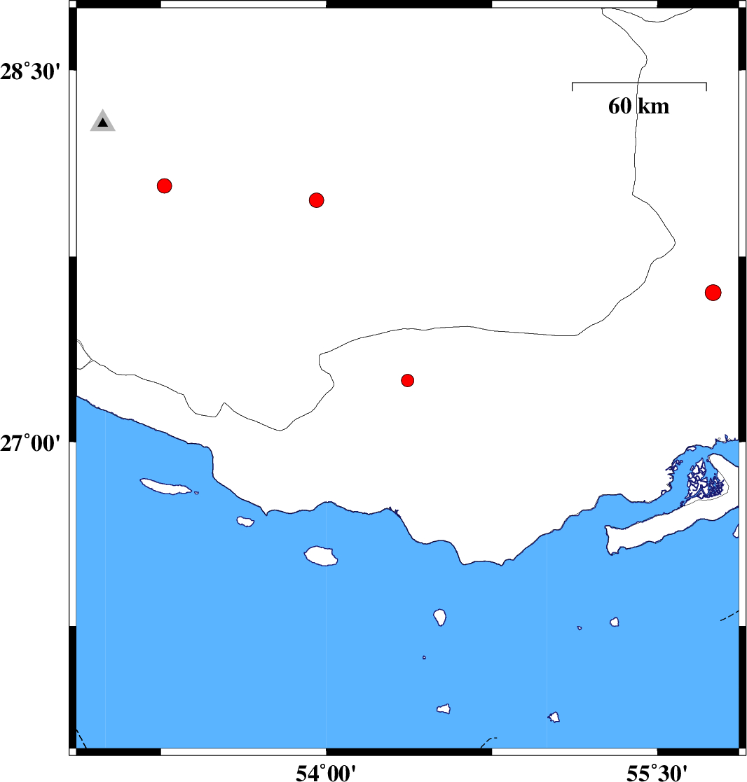 | 2016/02/21 | 01:06:14.9 | 04:36:14.9 | 27.249 | 54.368 | 17 | ML:2.5 | Hormozgan Province, 6 km of Bastak | ||