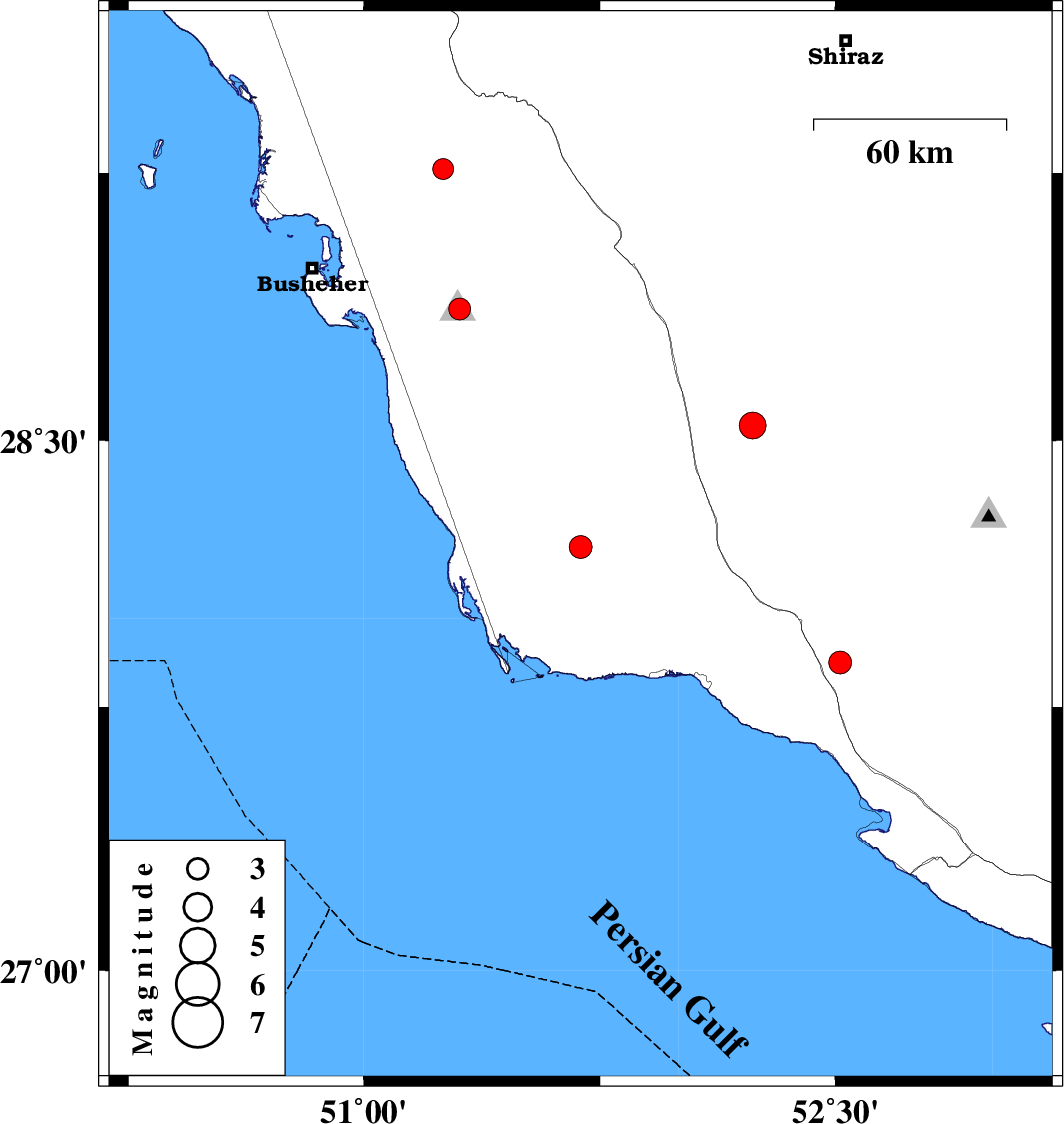 | 2016/01/30 | 11:59:34.4 | 15:29:34.4 | 29.262 | 51.251 | 6 | ML:3 | Bushehr Province, 4 km of Borazjan |
