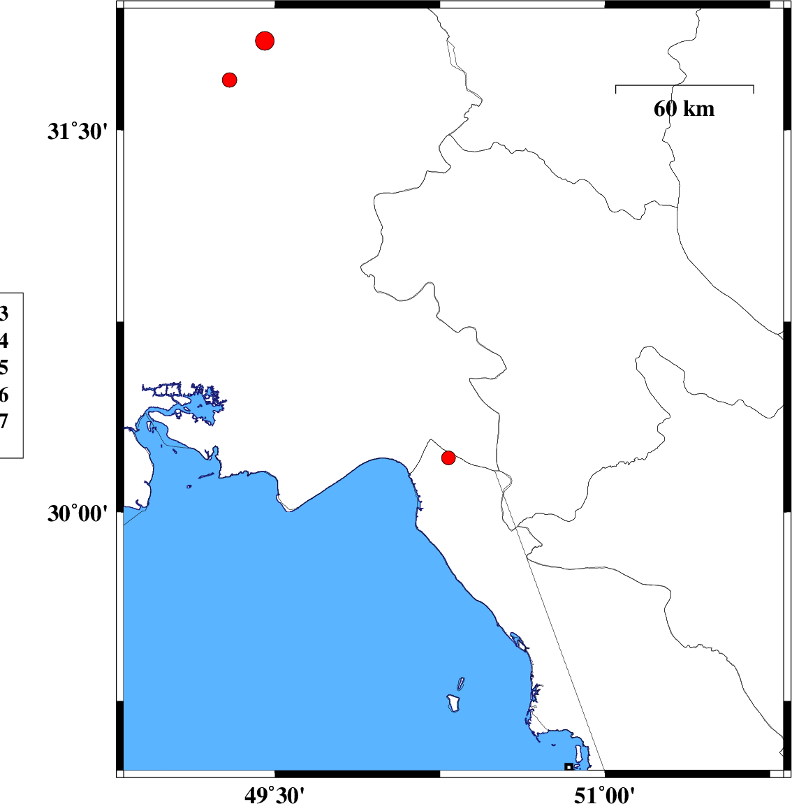 2016/03/10 | 14:07:23.8 | 17:37:23.8 | 30.474 | 50.312 | 18 | ML:3 | Khoozestan Province, 15 km South of Behbahan | ||